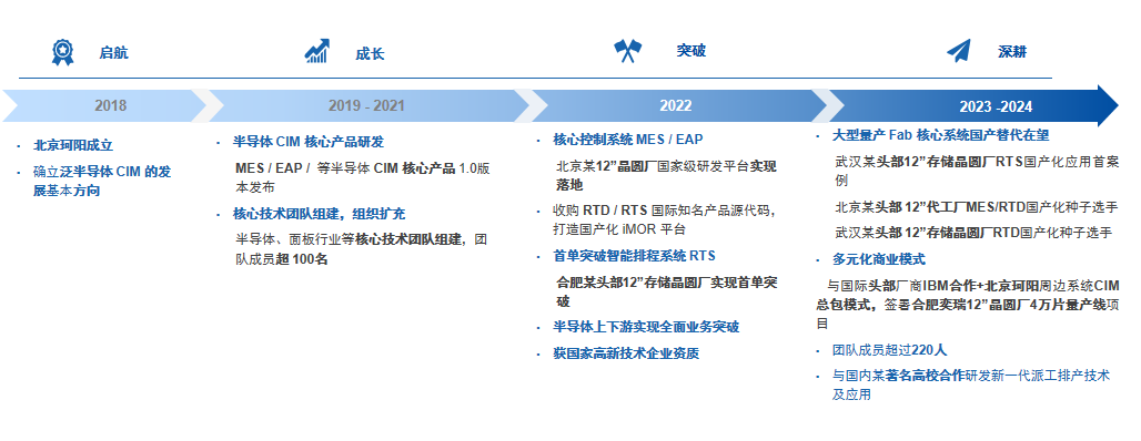 珂阳科技半导体CIM产品包括制造执行系统(MES)、设备自动化产品(EAP)、实时排程系统(RTS)、实时派工系统(RTD),生产自动化系统 (AQM)等核心产品。前期已为中国多家半导体龙头企业,包括:北京某国内头部代工厂,武汉某头部存储厂,合肥某头部存储厂,合肥晶合,北京某半导体设备龙头,合肥奕瑞,新锐光,江苏路芯,南京国兆,合肥奕瑞,等;泛半导体行业翘楚京东方、天马,以及一般制造业,格力、大金等众多行业龙头企业提供CIM产品和专业的系统实施服务,积累了丰富的行业案例和成功经验。