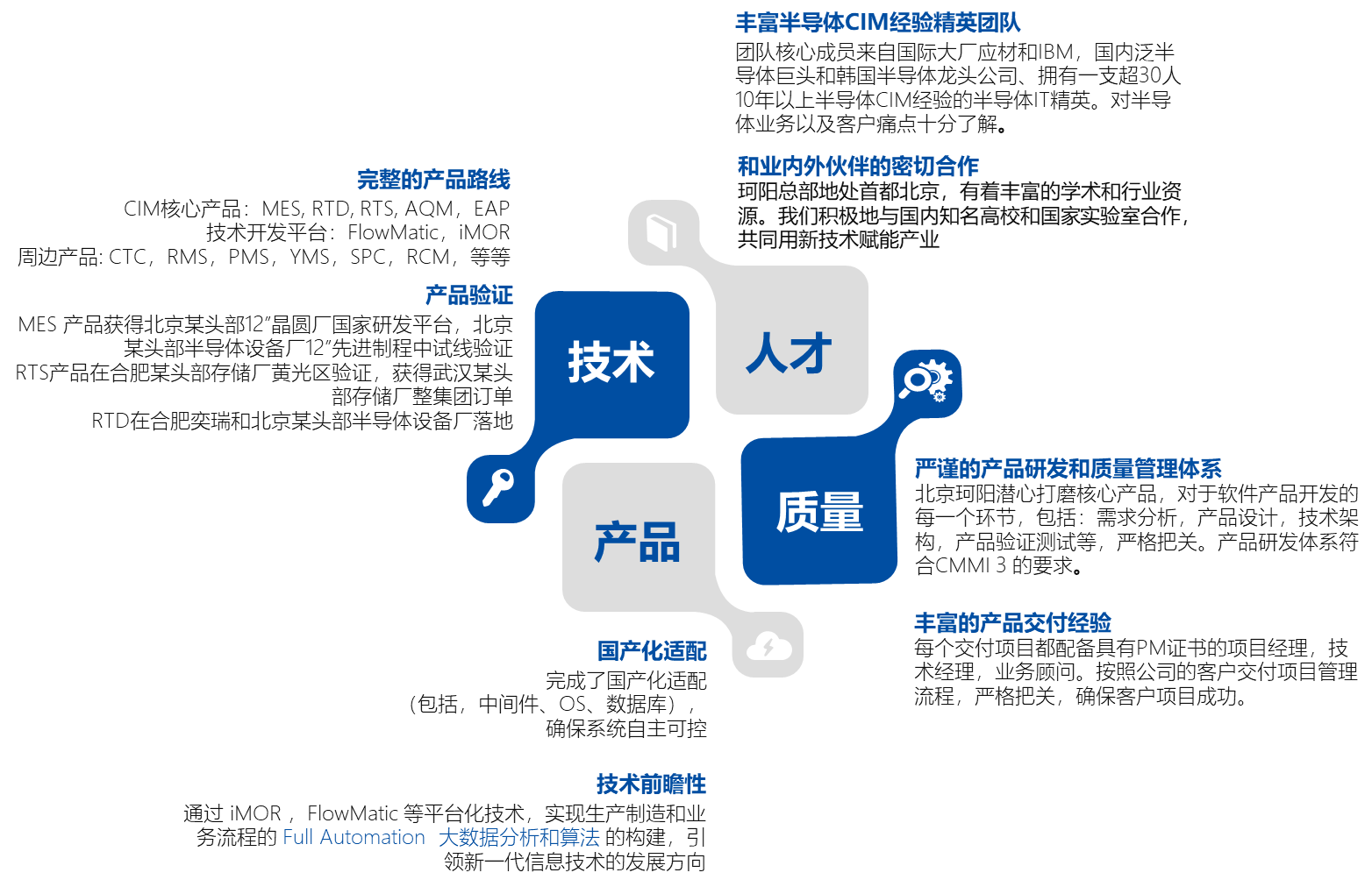 公司总部位于北京,在苏州、无锡、合肥等地设有分,子公司。现有员工230余人,整合了来自于国际和国内品牌的半导体行业CIM专家资源。拟融合新一代的物联网、大数据、AI技术,工业自动化技术,打造面向未来的全自动化的、智能化的半导体 CIM 系统。